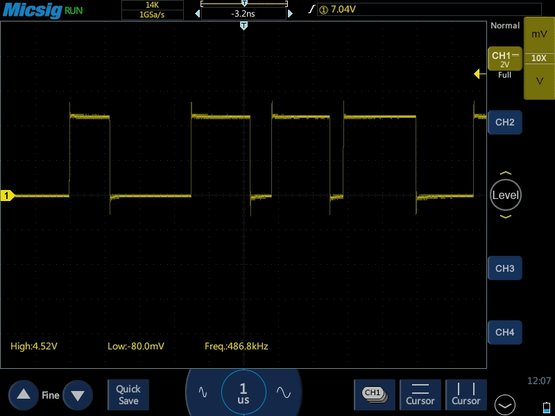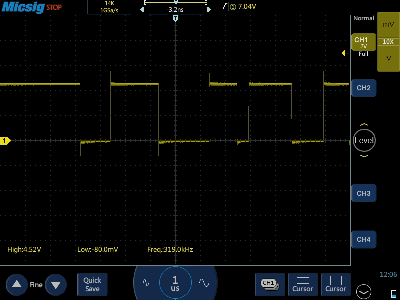 A shift regiszteren "átengedve" a jelet már szép (kellően gyors fel/lefutású) jelet kapunk, a nem túl gyors komparátorok ellenére is.